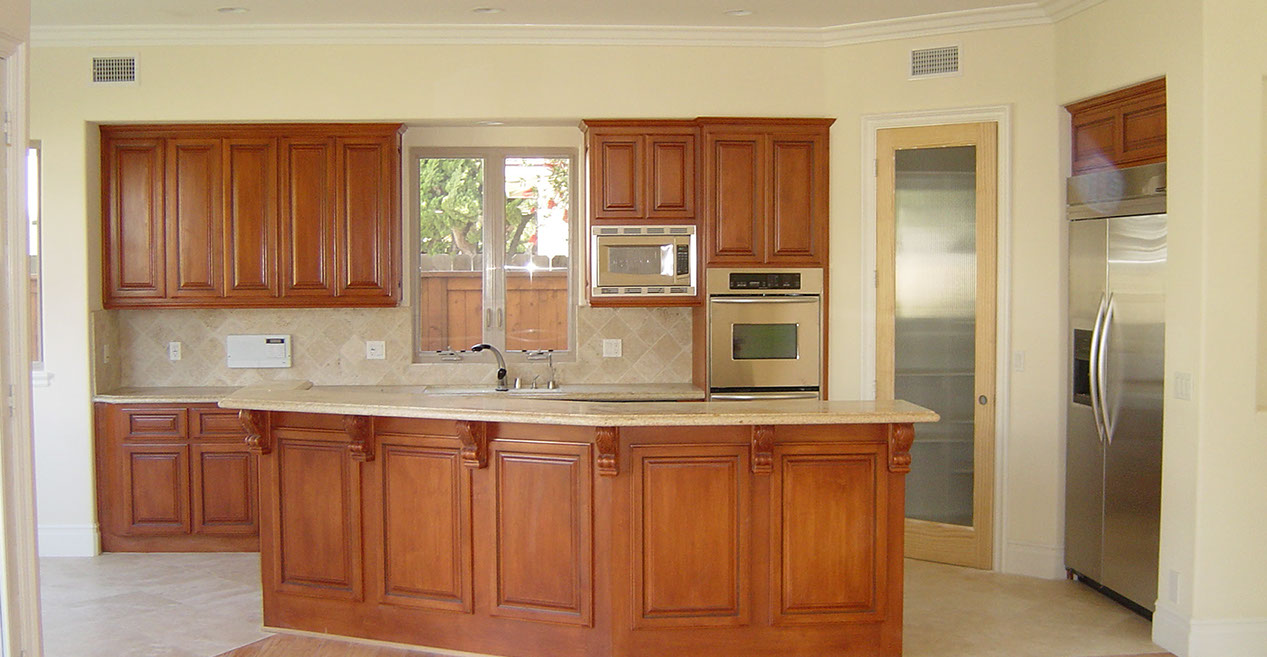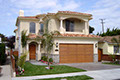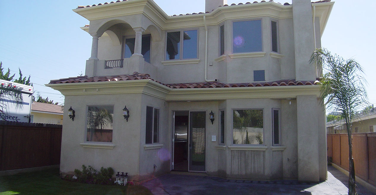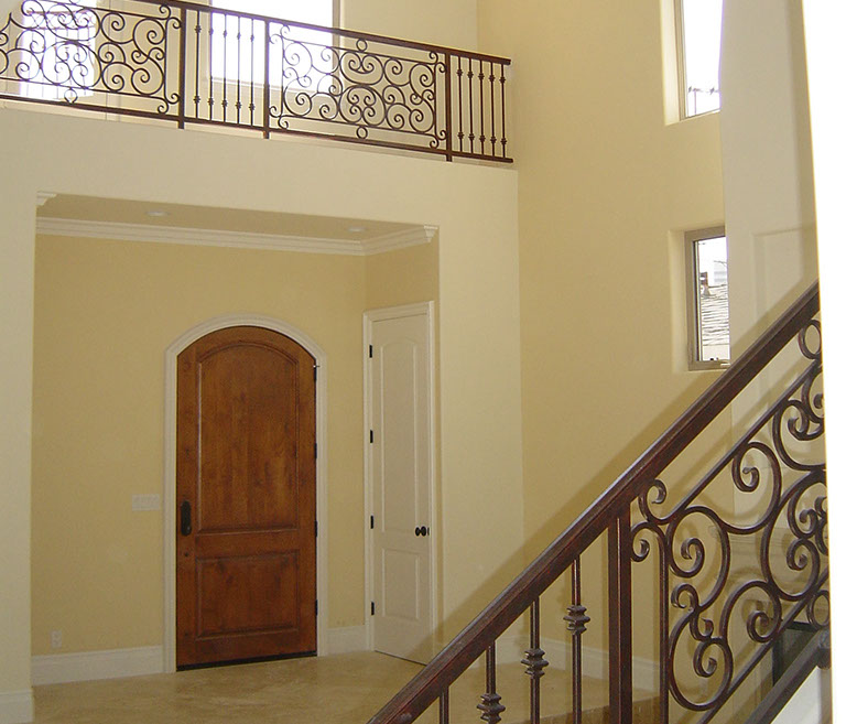 smooth stucco, covered entry with columns, arched wood front door and stone veneer