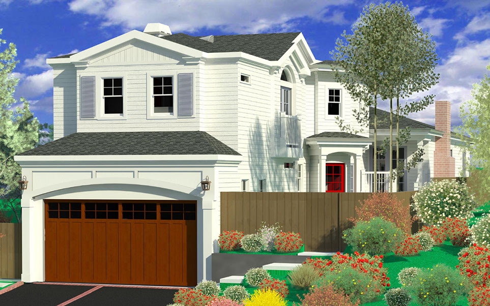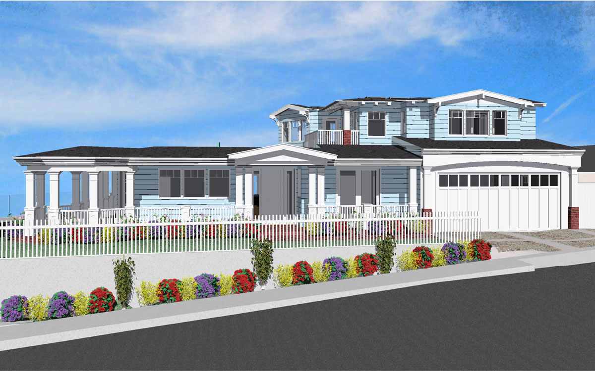 Hillside overlay traditional home with wraparound porch - designed to avoid view blockage