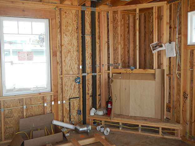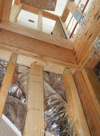 Framing - corner fireplace being framed. Chase was utilized for venting the tankless water heater from garage below. A three level chase was built from the garage to the third floor for the dumbwaiter.